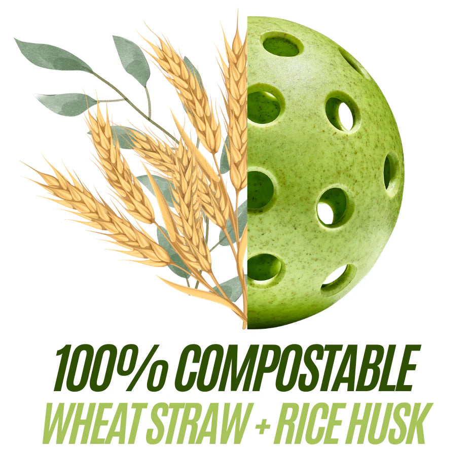 The Compost-A-Ball™ is a revolutionary invention from Professional Pickleball Partners (Pro-Pickle) that completely decomposes no matter how it is disposed of. Made with a patented blend of wheat straw and rice husk that mimics the physics of plastic, the Compost-A-Ball gives players a ball that meets industry standards without adding to the millions of pounds of plastic the sport creates.